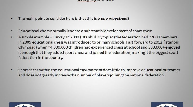 Sport chess involves competition, prize funds, tournaments and so on, whereas educational chess is a completely different challenge and has a completely different set of elements, stakeholders, purpose and result. In brief: